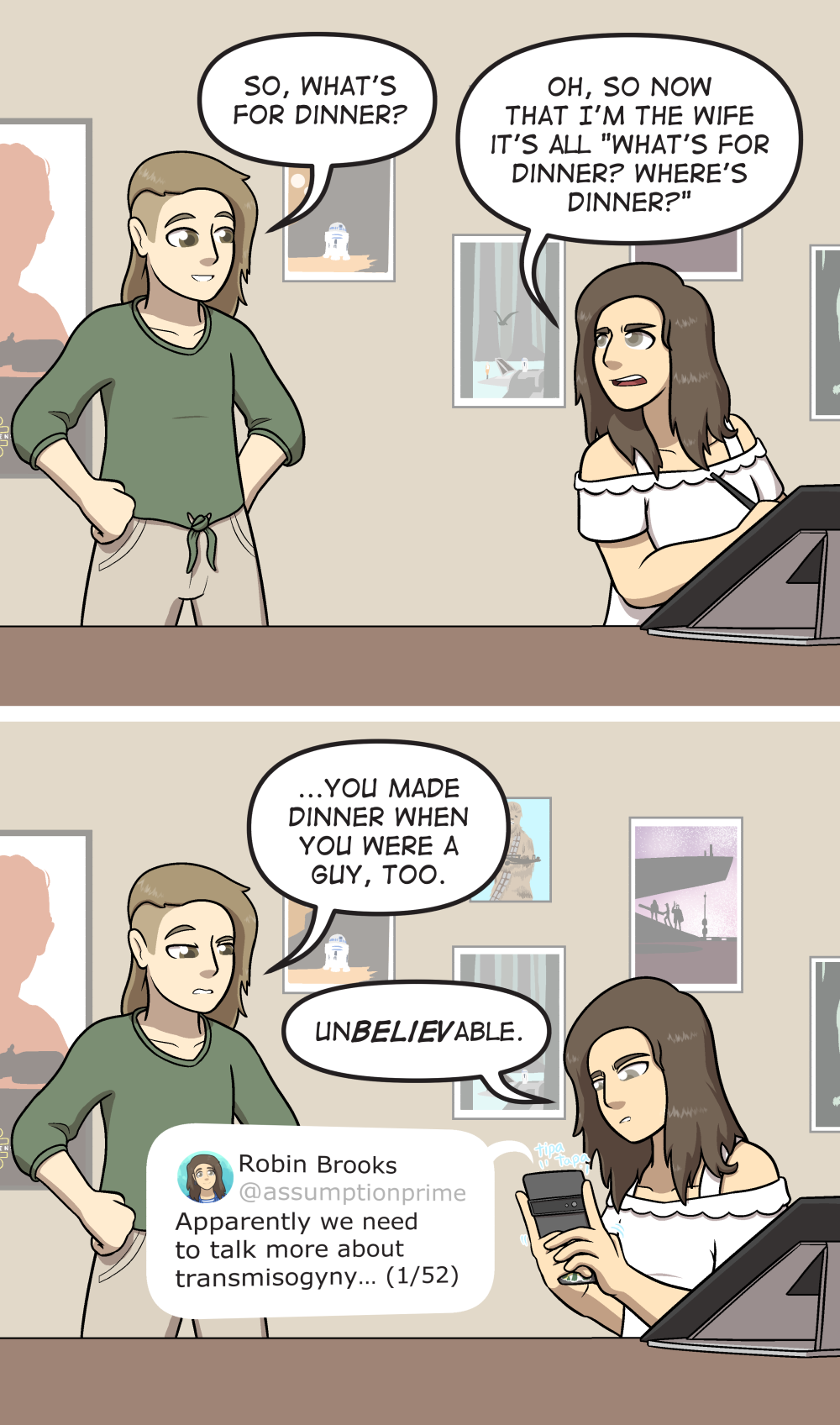 deadpanly responds, "...You made dinner when you were a guy, too." Robin